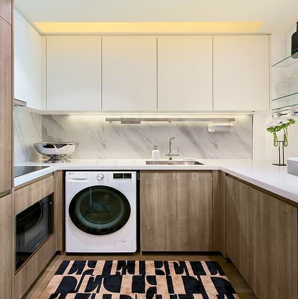 ครัวบิวท์อินครบชุด พร้อมเครื่องใช้ไฟฟ้า เช่น เตาไฟฟ้า เครื่องดูดควัน เครื่องล้างจาน ไมโครเวฟ และเครื่องซักอบผ้า รวมถึงชุดจาน ช้อน แก้ว พร้อมเข้าอยู่ทันที