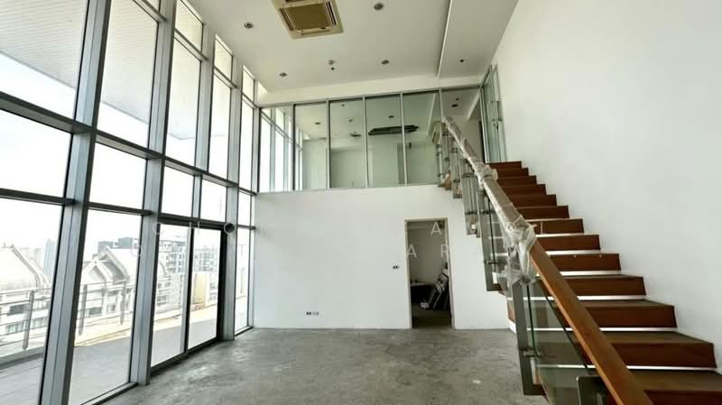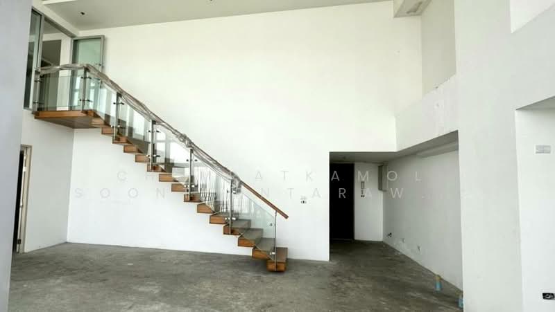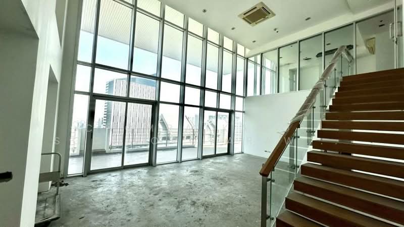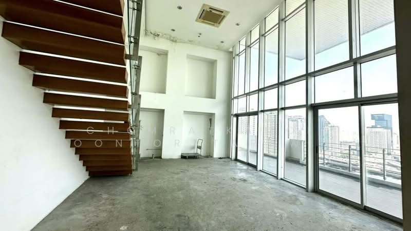 This spacious duplex condo offers a striking introduction with its double-height ceiling and floor-to-ceiling windows. The property is freehold and set on the 27th floor of Tower A in My Resort Bangkok. The interior size of 194 square meters provides generous living space across two levels with a contemporary urban feel.