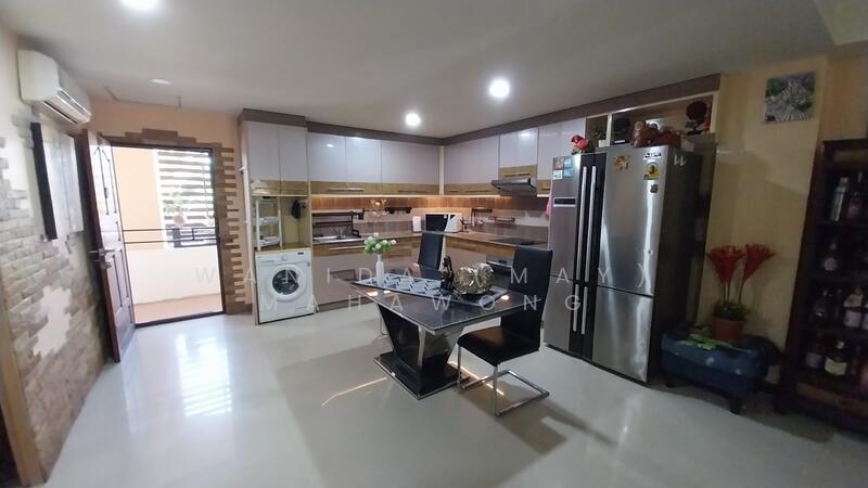 พื้นที่นั่งเล่นเชื่อมต่อกับครัวแบบเปิดซึ่งติดตั้งอุปกรณ์ครบ รองรับการใช้งานในชีวิตประจำวัน การตกแต่งสไตล์ไทยให้บรรยากาศอบอุ่น โปร่งโล่ง ด้วยประตูกระจกบานเลื่อนขนาดใหญ่ที่เปิดออกสู่ ระเบียงกว้าง ช่วยเพิ่มพื้นที่พักผ่อนและรับลมธรรมชาติ ระเบียงจัดเป็นมุมนั่งเล่นพร้อมวิวสวน เหมาะสำหรับการผ่อนคลายตลอดทั้งวัน
