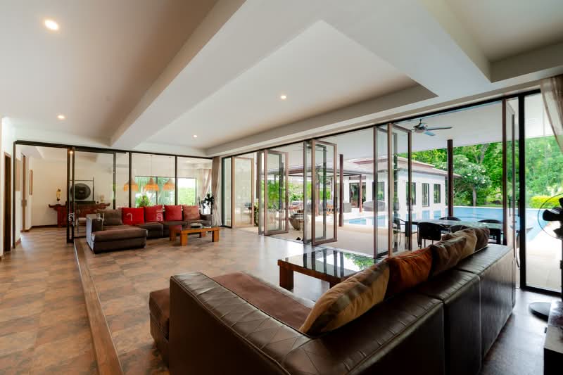 พื้นที่นั่งเล่นหลักออกแบบแบบเปิดโล่ง เชื่อมต่อพื้นที่ต่าง ๆ อย่างลงตัว ปูพื้นไม้เนื้อแข็งขัดเงา เพดานสูง และรับแสงธรรมชาติเต็มที่ผ่านหน้าต่างและประตูกระจกบานใหญ่ เชื่อมต่อพื้นที่ภายในสู่สวน ระเบียง และสระว่ายน้ำส่วนตัวได้อย่างกลมกลืน สะท้อนรูปแบบการใช้ชีวิตที่ผสานพื้นที่ภายในและภายนอกอย่างสมบูรณ์แบบ