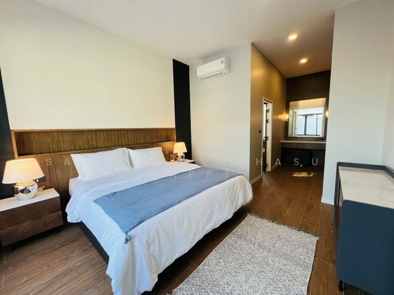Panalee Banna Village Panalee Banna village exudes timeless charm with its captivating blend of simplicity and modern architecture. Nestled amidst breathtaking natural surroundings, this village boasts an array of beautifully designed houses that epitomize exemplary craftsmanship. One such house stands out, a single-floor marvel that showcases the pinnacle of contemporary design. Upon entering, you'll be greeted by flexible living spaces that seamlessly flow together, creating an inviting and versatile atmosphere. With three spacious bedrooms and two elegant bathrooms, this house offers both comfort and style. Additionally, a dedicated working space provides the perfect environment for productivity, while a well-appointed dining area beckons for shared meals and cherished memories. The kitchen serves as the heart of the home, boasting exquisite marble surfaces and state-of-the-art Hafele appliances. An island breakfast bar offers a convenient spot for casual dining or entertaining guests. As you glide through the glass doors, a mesmerizing backyard garden unfolds before your eyes, providing a peaceful sanctuary and enchanting views of the surrounding nature. Panalee Banna village invites you to experience the harmonious fusion of contemporary design and natural beauty, offering a truly exceptional living environment for those seeking the perfect blend of style and tranquility.