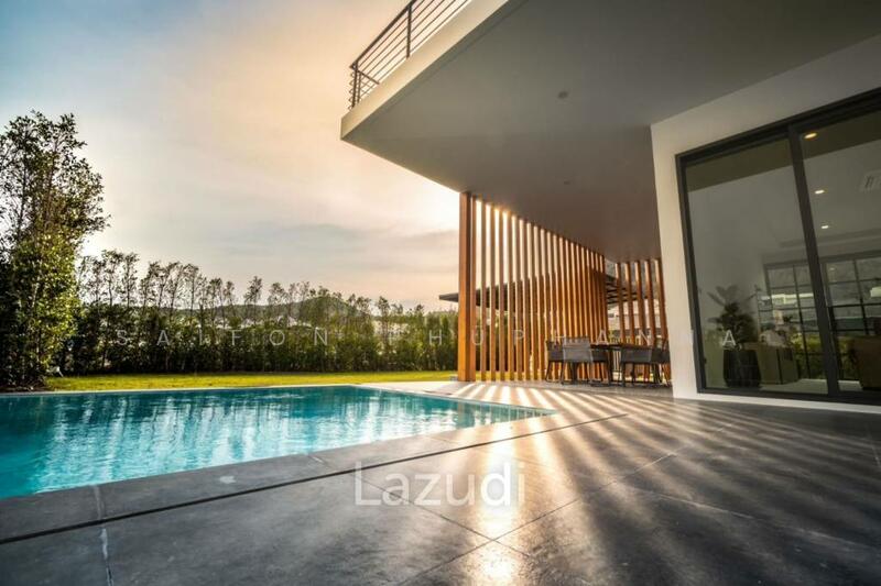 ตัวบ้านออกแบบเส้นสายทันสมัย หลังคาแบน เน้นกระจกบานใหญ่แบบเต็มผนัง เปิดรับแสงธรรมชาติและมุมมองสวนโดยรอบได้เต็มที่ การจัดวางฟังก์ชันเน้นความโปร่งโล่ง เชื่อมต่อพื้นที่ในบ้านกับลานสระว่ายน้ำอย่างลงตัว บ้านเป็นกรรมสิทธิ์แบบฟรีโฮลด์ เพิ่มความมั่นใจในการถือครองระยะยาว