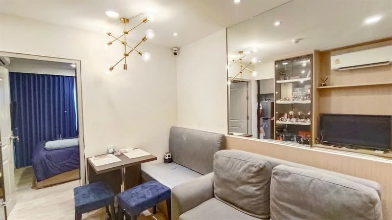 - ห้องรับแขกติดวอลเปเปอร์และติดตั้งกระจกเงาเพิ่มความกว้างของห้องพร้อมbuilt in ชั้นวางทีวีและตู้โชว์ มีโซฟา แอร์