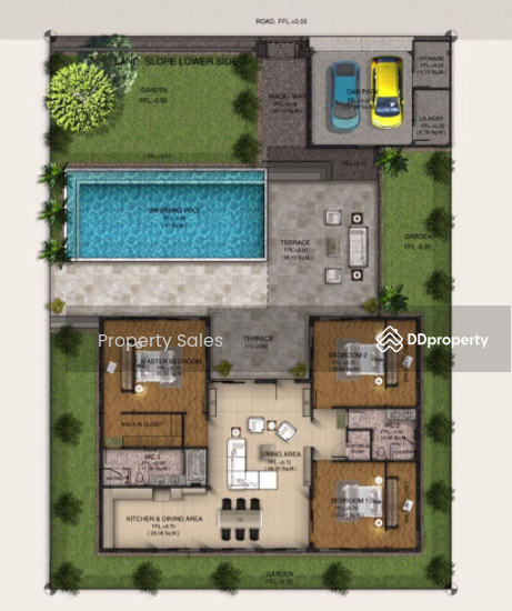 The house interior is a single-story villa with a large area. The project provides built-in furniture and ceiling lights to give a warm atmosphere. Besides, there are large mirrors around the house with blackout curtains. It also allows you to enjoy the outdoor area. There is a swimming pool, garden, and lawn for family activities. It is designed and decorated with a tropical garden to match the local climate, which is ready for you to breathe with fresh natural air in front of your home happily.