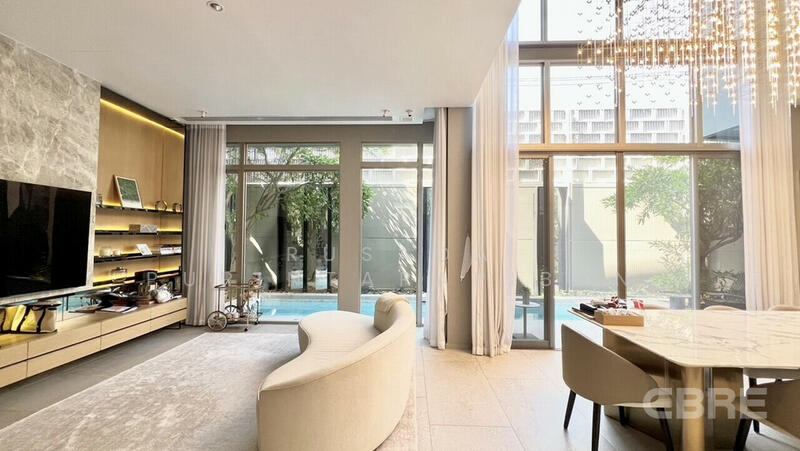 พื้นที่ใช้สอยกว้างขวาง: เพดานสูง Double Volume (6.5 เมตร) พร้อมกระจกบานใหญ่แบบ Full Height รับแสงธรรมชาติ