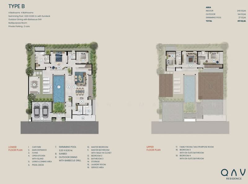 ควาฟ เรสซิเดนซ์ (QAV Residence) โครงการบ้านเดี่ยว 2 ชั้นสไตล์พูลวิลล่าพร้อมสระว่ายน้ำส่วนตัวทุกยูนิต บนทำเลที่แวดล้อมไปด้วยผืนป่าธรรมชาติ ใกล้กับสนามบินภูเก็ตเพียง 14.2 กิโลเมตร และไม่ไกลจากแหล่งอำนวยความสะดวก เป็นผลงานการพัฒนาโครงการจากบริษัท ฮอลบรู๊ค เอเชีย จำกัด โครงการนี้มีเนื้อที่ทั้งหมด 16 ไร่ 88 ตารางวา จำนวน 35 ยูนิต มีพื้นที่ใช้สอยตั้งแต่ 110.46-797.68 ตารางเมตร ขนาด 3-5 ห้องนอน 4-5 ห้องน้ำ คาดว่าจะแล้วเสร็จทั้งโครงการในปี 2568 และมีลักษณะการถือครองแบบขายขาด พร้อมสิ่งอำนวยความสะดวก เช่น คลับเฮ้าส์, ห้องออกกำลังกาย, สนามเทนนิส และระบบรักษาความปลอดภัยได้มาตรฐาน โครงการตั้งอยู่ภายในซอยป่าสัก 8 อำเภอถลาง ใกล้กับแหล่งอำนวยความสะดวกและสถานที่สำคัญในระยะทางไม่เกิน 20 กิโลเมตรจากโครงการ เช่น บลูทรีภูเก็ต, หาดบางเทา, โลตัส ถลาง, แม็คโคร ถลาง, มหาวิทยาลัยราชภัฏภูเก็ต และโรงพยาบาลถลาง เป็นต้น นอกจากนี้ผู้อยู่อาศัยยังสามารถเลือกเดินทางเข้า-ออกโครงการได้จาก 4 เส้นทางหลักด้วยกัน คือ ถนนบ้านดอน-เชิงทะเล ห่างจากโครงการประมาณ 1 กิโลเมตร, ถนนดอนจอมเฒ่า ห่างจากโครงการประมาณ 1.4 กิโลเมตร, ถนนศรีสุนทร ห่างจากโครงการประมาณ 2 กิโลเมตร และถนนเทพกระษัตรี ห่างจากโครงการประมาณ 4.4 กิโลเมตร โดยถนนเทพกระษัตรี คือถนนหลักของพื้นที่นี้ ใช้สำหรับเดินทางเชื่อมต่อไปสู่จังหวัดใกล้เคียงได้ หรือจะใช้เป็นเส้นทางเชื่อมต่อเพื่อเข้าสู่กรุงเทพมหานครก็ได้เช่นกัน ควาฟ เรสซิเดนซ์ (QAV Residence) เป็นโครงการบ้านเดี่ยวที่ออกแบบสไตล์พูลวิลล่า มีสระว่ายน้ำส่วนตัวทุกยูนิต เพื่อความสุขแบบเป็นส่วนตัวในทุกช่วงเวลา โดยบรรยากาศโดยรอบโครงการอุดมสมบูรณ์ไปด้วยผืนป่าสีเขียว สร้างความสงบและความรู้สึกผ่อนคลายในอารมณ์ ตัวบ้านภายนอกออกแบบด้วยสไตล์โมเดิร์น เรียบง่ายแต่ทันสมัย โดยตัวบ้านมีลักษณะคล้ายตัว L โดยบริเวณช่องว่างของตัว L จะเป็นโซนสระว่ายน้ำส่วนตัว ที่ออกแบบให้มีศาลาพักผ่อนริมสระ พร้อมทางเดินเชื่อมต่อไปสู่พื้นที่อาบน้ำล้างตัวกลางแจ้งภายในส่วนหย่อมส่วนตัว ที่ออกแบบพุ่มไม้ทรงสูงเอาไว้ให้สำหรับใช้บังสายตา ส่วนตัวบ้านเลือกใช้ผนังกระจกใสแบบเต็มบาน เพื่อการรับแสงธรรมชาติและวิวทิวทัศน์อันสวยงามได้จากทุกมุมโปรดของบ้าน ภายในตัวบ้านโดดเด่นด้วยห้องรับแขกที่มีความสูงเพดาน 4.5 เมตร โปร่งสบายพร้อมตกแต่งด้วยไม้สักสีน้ำตาลทองสวยงาม อีกทั้งยังเปิดพื้นที่เชื่อมต่อไปสู่พื้นที่รับประทานอาหาร ที่มีประตูกระจกสามารถเปิดออกไปสู่สระว่ายน้ำได้ ช่วยให้ทุกกิจกรรมต่อเนื