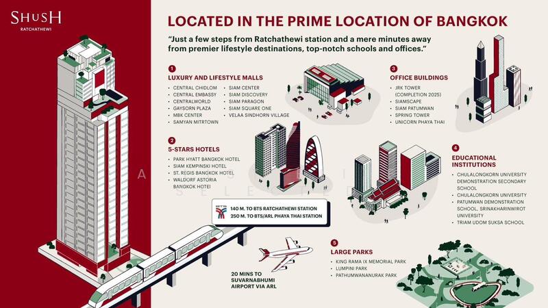ชูช์ ราชเทวี (SHUSH Ratchathewi) โครงการคอนโดมิเนียมความสูง 32 ชั้น บนทำเลติดถนนพญาไท ใจกลาง CBD ราชเทวี เพียง 140 เมตรถึงรถไฟฟ้า BTS สถานีราชเทวี และใกล้กับสยามดิสคัฟเวอรี่เพียง 800 เมตร เป็นผลงานการพัฒนาโครงการจากบริษัท แสนสิริ จำกัด (มหาชน) โครงการนี้มีเนื้อที่ประมาณ 2 ไร่ จำนวน 383 ยูนิต มีพื้นที่ใช้สอยตั้งแต่ 31.25-117.25 ตารางเมตร ขนาด 1-3 ห้องนอน 1-3 ห้องน้ำ คาดว่าจะแล้วเสร็จในปี 2569 และมีลักษณะการ ด้วยทำเลที่ตั้งที่มีความอุดมสมบูรณ์สูง ทำให้การเข้าถึงสถานที่สำคัญและแหล่งไลฟ์สไตล์ของผู้อยู่อาศัยใช้ระยะทาง และใช้เวลาไม่นาน โดยในรัศมี 5 กิโลเมตรรอบโครงการมีสถานที่ที่น่าสนใจ เช่น คิงเพาเวอร์ รางน้ำ, สยามพารากอน, เซ็นทรัลเวิลด์, เอ็ม บี เค เซ็นเตอร์, มหาวิทยาลัยสวนดุสิต และโรงพยาบาลราชวิถี เป็นต้น ชูช์ ราชเทวี (SHUSH Ratchathewi) มีแนวคิดในการออกแบบโครงการ คือ ซิมโฟนี บทใหม่ของการใช้ชีวิต บนทำเล CBD ราชเทวี ที่แวดล้อมไปด้วยความอุดมสมบูรณ์ ผสานพื้นที่สีเขียวและสิ่งอำนวยความสะดวกครบครัน การออกแบบห้องพักอาศัยเน้นห้องความสูงเพดาน 4.5 เมตรสไตล์ Loft และมีห้อง Simplex ที่มีความสูงเพดาน 2.7 เมตร พร้อมเปิดการขายแบบ Fully Fitted ที่ผู้อยู่อาศัยจะได้รับ เครื่องปรับอากาศแบบฝังฝ้า เคาน์เตอร์ทำครัวปูท็อปด้วยกระเบื้องลายหินอ่อนแผ่นใหญ่ พร้อมตู้เก็บของแบบแขวนผนังและตั้งพื้น เตาแม่เหล็กไฟฟ้า, เครื่องดูดควัน, อ่างล้างจาน และไมโครเวฟ Built-in ตู้เก็บรองเท้า ตู้เสื้อผ้า ด้านในมีตู้เซฟ และห้องเก็บของใต้บันได มีชั้นวางของ (เฉพาะห้อง Loft) สุขภัณฑ์ภายในห้องน้ำครบชุด พร้อมฉากกั้น ปลั๊กไฟและสวิตช์แบบ ART DNA ติดตั้งกระจก Low-E สามารถป้องกันความร้อน ช่วยสะท้อนรังสียูวี และป้องกันละอองน้ำ ติดตั้ง Digital Door Lock แบบ 5 ระบบ จากแบรนด์ Philips ความสูงเพดาน 4.5 เมตร ชั้นลอยมีความสูงเพดาน 2.25 เมตร และภายในห้องนอนมีความสูงเพดาน 2.2 เมตร ส่วนค่าใช้จ่ายส่วนกลางคิดตามโฉนดจริง คือ เฉพาะพื้นที่ชั้น 1 ไม่รวมชั้นลอย พื้นที่โฉนด 28.50-28.75 ตาราเมตร พื้นที่ใช้สอย 40.75-41.25 ตารางเมตร ขนาด 1 ห้องนอน 1 ห้องน้ำ และ 1 ห้องโถง พื้นที่โฉนด 34.25-35.50 ตารางเมตร พื้นที่ใช้สอย 49-50.50 ตารางเมตร ขนาด 1 ห้องนอน 1 ห้องน้ำ และ 1 ห้องโถง พื้นที่โฉนด 41.75-46.75 ตารางเมตร พื้นที่ใช้สอย 62.75-75.75 ตารางเมตร ขนาด 2 ห้องนอน 2 ห้องน้ำ และ 1 ห้องโถง มีความสูงเพดาน 2.7 เมตร พื้นที่ใช้สอย 31.25-57.25 ตารางเมตร ขนาด 1 ห้องนอน 1 ห้องน้ำ และ 1 ห้องโถง พื้นที่ใช้สอย 60 ตารางเมตร ขนาด 2 ห้องนอน 1 ห้องน้ำ และ 1 ห้องโถง พื้นที่ใช้สอย 70.25-89.50 ตารางเมตร ขนาด 2 ห้องนอน 2 ห้องน้ำ และ 1 ห้องโถง พื้นที่ใช้สอย 97-117.25 ตารางเมตร ขนาด 3 ห้องนอน 3 ห้องน้ำ และ 1 ห