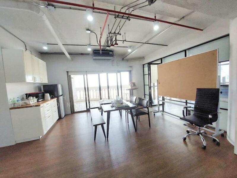 Additional open-plan office space includes large windows, sliding glass doors, and balcony access. Glass partition walls form a separate enclosed room that can serve as a private office or meeting area. White painted walls and exposed ceiling ducting give the interior a modern industrial feel.