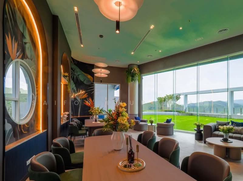 ห้องเป็นแบบ 2 ห้องนอน 2 ห้องน้ำ ฟังก์ชันกว้างกว่าคอนโดทั่วไปในเมือง ห้องนั่งเล่นแบบเปิดโล่งเชื่อมกับพื้นที่รับประทานอาหารและครัว ทำให้ใช้งานสะดวกและเหมาะกับการใช้ชีวิตประจำวัน ผนังโทนสีอ่อนร่วมกับไฟดาวน์ไลท์ช่วยให้ห้องดูกว้างและโปร่งสบายมากขึ้น