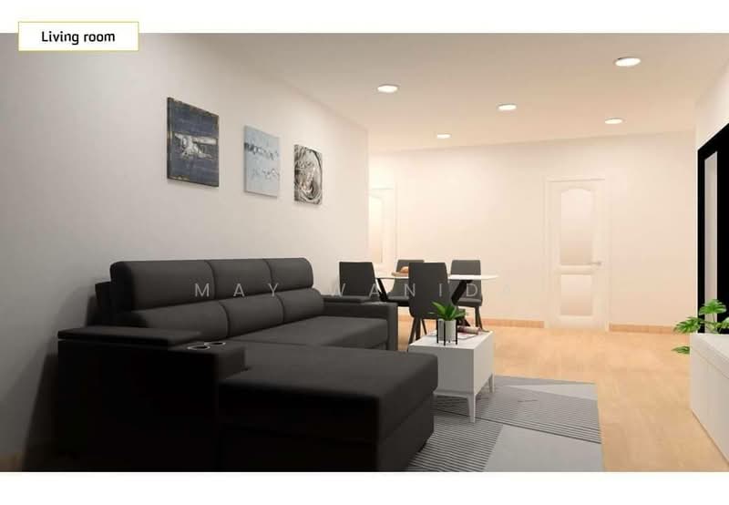 ภายในห้องตกแต่งอย่างเรียบง่ายและลงตัว พื้นที่นั่งเล่นและรับประทานอาหารเชื่อมต่อกันอย่างเป็นสัดส่วน พร้อมหน้าต่างบานใหญ่ที่เปิดรับแสงธรรมชาติ และวิวเมืองที่มองได้อย่างเพลิดเพลินในทุกช่วงเวลา