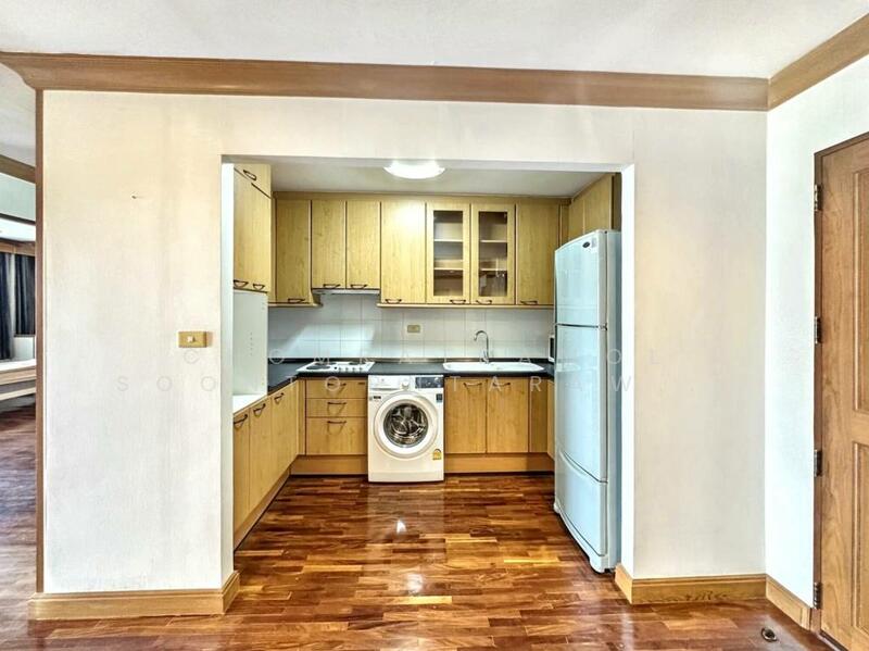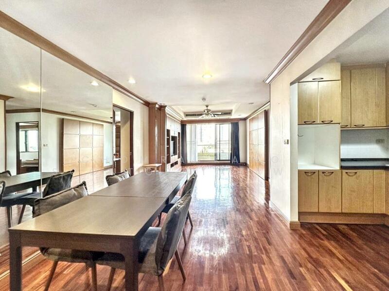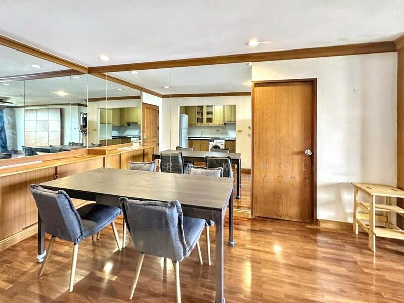 Experience the epitome of urban living at Supreme Ville, nestled within the vibrant heart of Sathon, Bangkok. This exquisite 2-bedroom, 2-bathroom condo, located on the 7th floor of an eight-story complex, offers a generous interior space of 118.84 sqm. The unit showcases fully furnished interiors, featuring polished hardwood flooring, expansive windows, and seamless wood trims that accentuate its open-plan layout. The condo’s interior is further elevated by modern amenities, including ceiling fans, built-in cabinetry, and recessed lighting.