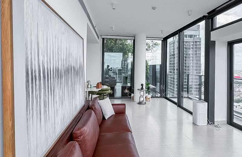 ยูนิตพรีเมียมขนาดใหญ่ 92.5 ตร.ม. บนชั้นสูงของ Tait Sathorn 12 พร้อมผนังกระจกเต็มบานรอบห้อง ทำให้สัมผัสวิวเมืองสาทรแบบเต็มตา ทั้งห้องนั่งเล่น โซนทำงาน และห้องนอน เพดานสูงให้บรรยากาศโปร่งเป็นพิเศษ การตกแต่งเน้นโทนโมเดิร์นเรียบหรู