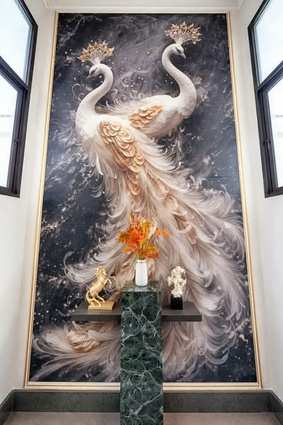 Featuring top-tier Italian designer furniture, including a handcrafted Italian “piano-key” sofa, Persian carpets, Prada green luxury stone tea table, tassel crystal chandeliers, Edra petal bed, grand crystal chandeliers, oversized peacock sculpture, fireplace feature wall, and a 4-meter statement wall art.