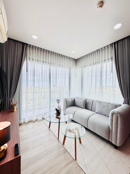 พื้นที่นั่งเล่นเชื่อมต่อกับห้องครัวและห้องนอนได้อย่างราบรื่น ทำให้จัดวางเฟอร์นิเจอร์ได้อย่างยืดหยุ่นและใช้งานได้ง่าย ยิ่งไปกว่านั้น ห้องชุดนี้มีเฟอร์นิเจอร์บิวท์อินและเครื่องใช้ไฟฟ้าครบครัน พร้อมเข้าอยู่ได้ทันที