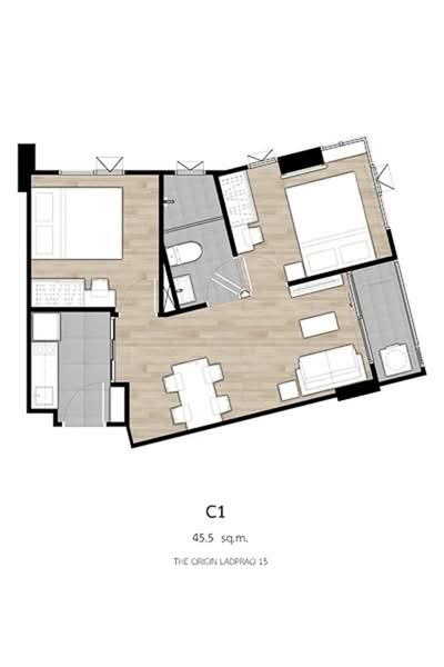 ดิ ออริจิ้น ลาดพร้าว 15 คอนโดมิเนียม Low Rise 8 ชั้น ย่านลาดพร้าว เป็นผลงานการออกแบบและก่อสร้างโดยบริษัท ออริจิ้น พร็อพเพอร์ตี้ จำกัด (มหาชน) โครงการมีเนื้อที่ 1 ไร่ 1 งาน 6 ตารางวา จำนวน 163 ยูนิต มีพื้นที่ใช้สอยตั้งแต่ 24.5-45.5 ตารางเมตร ขนาด 1-2 ห้องนอน 1 ห้องน้ำ 1 ห้องครัวมีการถือครองแบบขายขาด ตัวอาคารออกแบบเป็นรูปตัว L ในสไตล์ Iconic Black & White ภายใต้แนวคิด “เรียบง่ายแต่ไม่ธรรมดา” เน้นการใช้สีโมโนโทนที่เข้ากับไลฟ์สไตล์คนรุ่นใหม่ อีกทั้งยังช่วยให้กลมกลืนกับบรรยากาศโดยรอบโครงการที่เป็นบ้านพักอาศัยดั้งเดิม โครงการจัดเตรียมสิ่งอำนวยความสะดวกไว้รองรับอย่างครบครัน ทั้งล็อบบี้, สวนสาธารณะ, Co-working Space, Meeting Room,สระว่ายน้ำ, ห้องออกกำลังกาย และห้องดูหนังฟังเพลง มีการรักษาความปลอดภัยด้วยระบบกล้องวงจรปิดและเจ้าหน้าที่รักษาความปลอดภัยตลอด 24 ชั่วโมง นอกจากนั้นภายนอกโครงการยังเต็มไปด้วยแหล่งอำนวยความสะดวกมากมาย ทั้งสถานีรถไฟฟ้าสายสีน้ำเงิน, สถานีรถไฟฟ้า BTS,บิ๊กซี เอ็กซ์ตร้า, เซ็นทรัลพลาซา ลาดพร้าว, ยูเนียน มอลล์, โรงเรียนหอวัง, และโรงพยาบาลเปาโล โชคชัย 4ดิ ออริจิ้น ลาดพร้าว 15ขายแบบ Fully Fitted ใช้ระบบ Home Automation ที่สามารถควบคุมการเปิด-ปิดไฟและเครื่องปรับอากาศผ่านแอปพลิเคชัน พื้นภายในห้องทั้งหมดปูด้วยไม้ลามิเนต ยกเว้นห้องครัวที่ปูด้วยกระเบื้องแกรนิตโต้ ฝาฉาบเรียบเพดานสูง 2.5 เมตร ติดไฟดาวน์ไลท์ ประตูทางเข้าระบบ Digital Door Lock ด้านข้างประตูเป็นตู้ Built-in ขนาดใหญ่สำหรับเก็บรองเท้าและสิ่งของ ถัดมาเป็นพื้นที่นั่งเล่นสามารถวางโซฟายาวขนาด 2-3 ที่นั่งได้ ผนังติดตั้งชั้นวางโทรทัศน์แบบ Built-in พร้อมชั้นวางของ ในส่วนห้องครัวจะเป็นแบบครัวปิดที่กั้นด้วยประตูกระจกบานเลื่อน มีเคาน์เตอร์ Built-in ติดตั้งอ่างล้างจาน, เตาไฟฟ้า 2 หัว, เครื่องดูดควัน, ชั้นวางไมโครเวฟ และตู้ลอยเก็บของ ห้องนอนดูโปร่งโล่งด้วยประตูบานเลื่อนขนาดใหญ่แบบ 3 ตอนมีเตียงพร้อมลิ้นชักเก็บของใต้เตียง ตู้เสื้อผ้า Built-in บานกระจกใส ช่องแสงภายในห้องขนาดเต็มความกว้างของห้องพร้อมหน้าต่างบานกระทุ้ง 1 บานเพื่อเปิดระบายอากาศ สำหรับห้องน้ำนั้นออกแบบโดยแบ่งแยกโซนเปียกโซนแห้งชัดเจน ปูพื้นและกรุผนังด้วยกระเบื้อง เลือกใช้สุขภัณฑ์ยี่ห้อ Häfele มีอ่างล้างหน้าแบบฝังบนเคาน์เตอร์ โถสุขภัณฑ์แบบ Dual Flush ด้านในกั้นเป็นห้องอาบน้ำด้วยกระจกนิรภัย ติดตั้ง Hand Shower พร้อมชั้นวางอุปกรณ์อาบน้ำ แบบห้องพักภายในโครงการมีดังต่อไปนี้พื้นที่ใช้สอย 24.5-35 ตารางเมตร ขนาด 1 ห้องนอน 1 ห้องน้ำ และ 1 ห้องครัวพื้นที่ใช้สอย 35.5-36 ตารางเมตร ขนาด 1-2 ห้องนอน 1 ห้องน้ำ และ 1 ห้