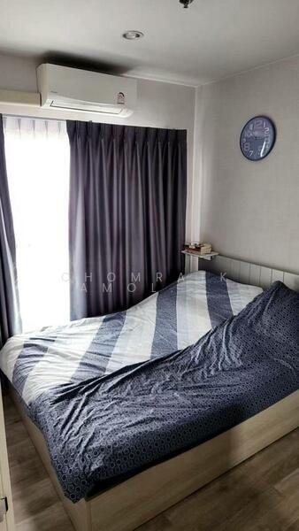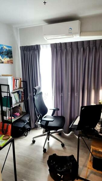With a smart 35 sqm layout, this fully furnished condo maximizes space and luxury. The living room includes an air conditioner, a cozy sofa, a coffee table, and a flat-screen TV, complemented by large windows and a private balcony—perfect for enjoying the stunning Bangkok skyline. Elegant curtains and wooden flooring add a touch of warmth and elegance.
