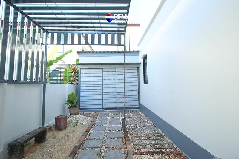 หลังบ้าน : ครัวไทยแบบโปร่ง หลังคาเรียบร้อย เคาน์เตอร์ปูน ทำครัวหนักได้