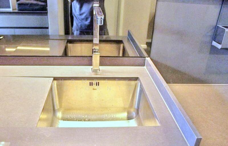 The kitchen is designed with functionality and style, featuring modern cabinetry, sleek countertops, and built-in appliances. An integrated work desk provides a practical touch, while hardwood flooring and a mirror backsplash add to the chic ambiance.