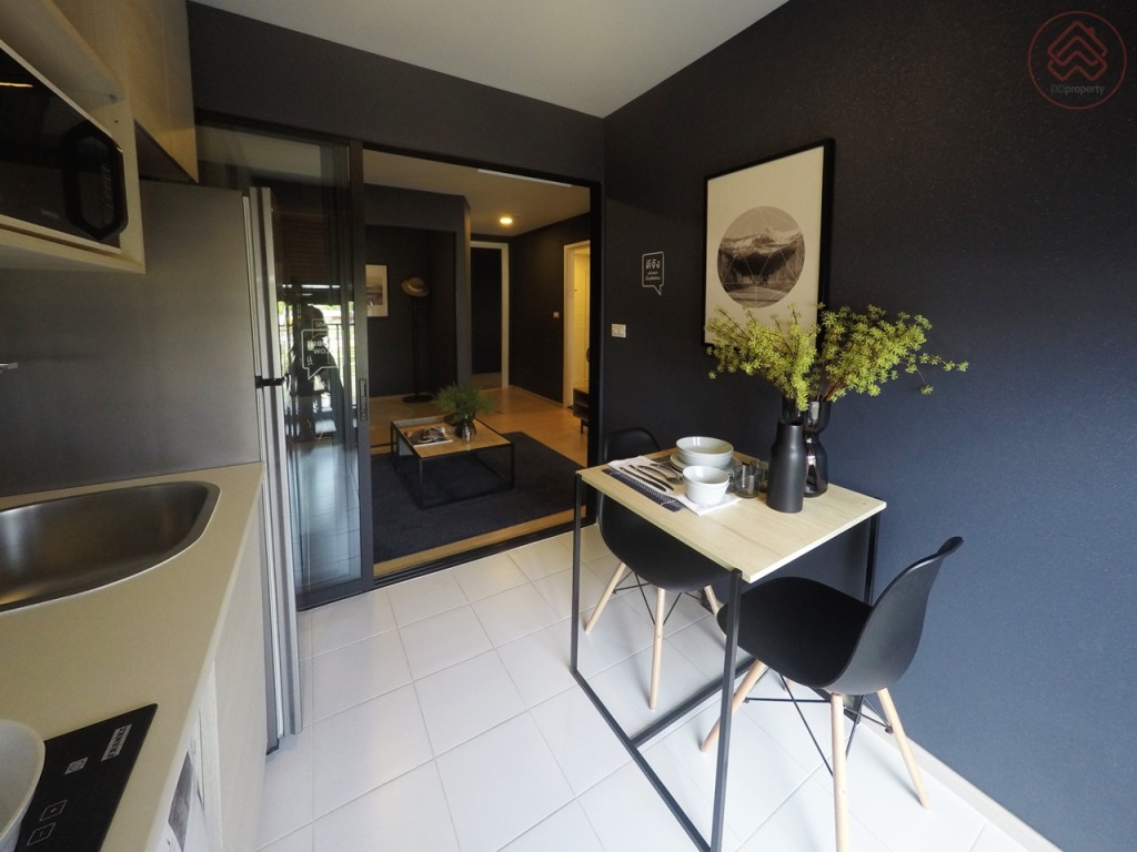 ถัดมาเป็นโซนรับประทานอาหาร ขนาดกะทัดรัด สามารถนั่งได้ 2 คน ก็เพียงพอต่อการใช้งาน ถัดไปเป็นห้องนอน และห้องครัว ซึ่งทั้ง 2 โซนนี้ทางโครงการได้กัดห้องไว้ให้เป็นสัดส่วนแล้วด้วย ถือว่าผู้ที่พักอาศัยไม่ต้องทำอะไรเพิ่มเลยทีเดียว