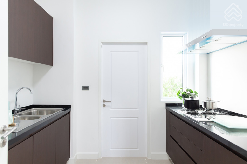 ห้องครัว ออกแบบเป็นแบบปิด สามารถทำอาหารโดยที่กลิ่นและควันไม่ออกมารบกวนพื้นที่ส่วนอื่น ๆ ภายในบ้าน โดยพื้นห้องครัวดรอปจากพื้นบ้านประมาณ 5 เซนติเมตร ด้านข้างมีหน้าต่างกระจกบานกระทุ้ง ขนาดประมาณ 45×115 เซนติเมตร สามารถเปิดระบายอากาศ หรือเปิดรับแสงและลมธรรมชาติ และมีประตูเพื่อเชื่อมต่อไปยังส่วนซักล้างทางด้านหลังบ้าน