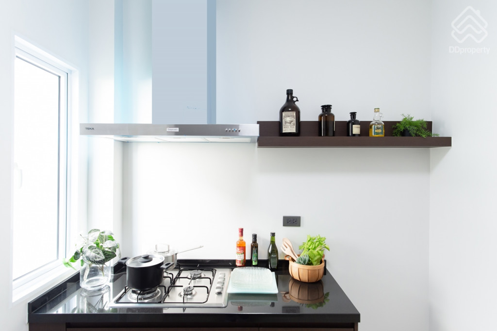 บ้านตัวอย่างออกแบบเป็นเคาน์เตอร์สำหรับใช้ในการประกอบอาหาร มีเครื่องดูดควันและชั้นวางสำหรับวางอุปกรณ์ต่าง ๆ